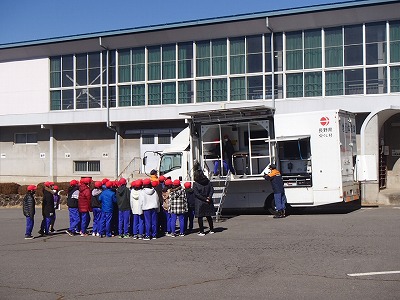 地震体験車が来ました。 本来ですと、もっと前に来る予定だったそうですが、新型コロナウイルスの影響でこの時期となってしまったそうです。 3年生から学習を始めました。 今日は、気温が下がったので待っている人は玄…