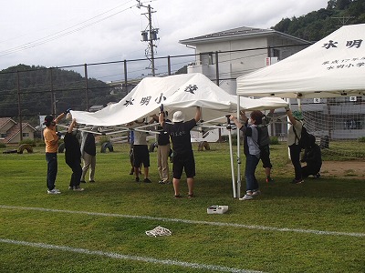 学校の様子 運動会前日 suadmin 2020年9月18日 明日は、今年度初めての学校行事「水明小学校大運動会」です。 保護者の皆さんの受付は7時30分から始まります。 地区ごとで駐車場所が決まっておりますのでご注意ください。 今日は、PTA役員の皆さんにお手伝いいただきテント18張、すべて設置できました。 ご協力、ありがとうございました。 今年は、規模を縮小し半日開催ですが、来校をお待ちしております。