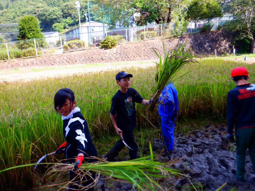 稲刈りではぬかるんだ田んぼに足をとられながらも育った稲を一生懸命に刈り取りました。